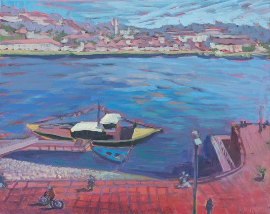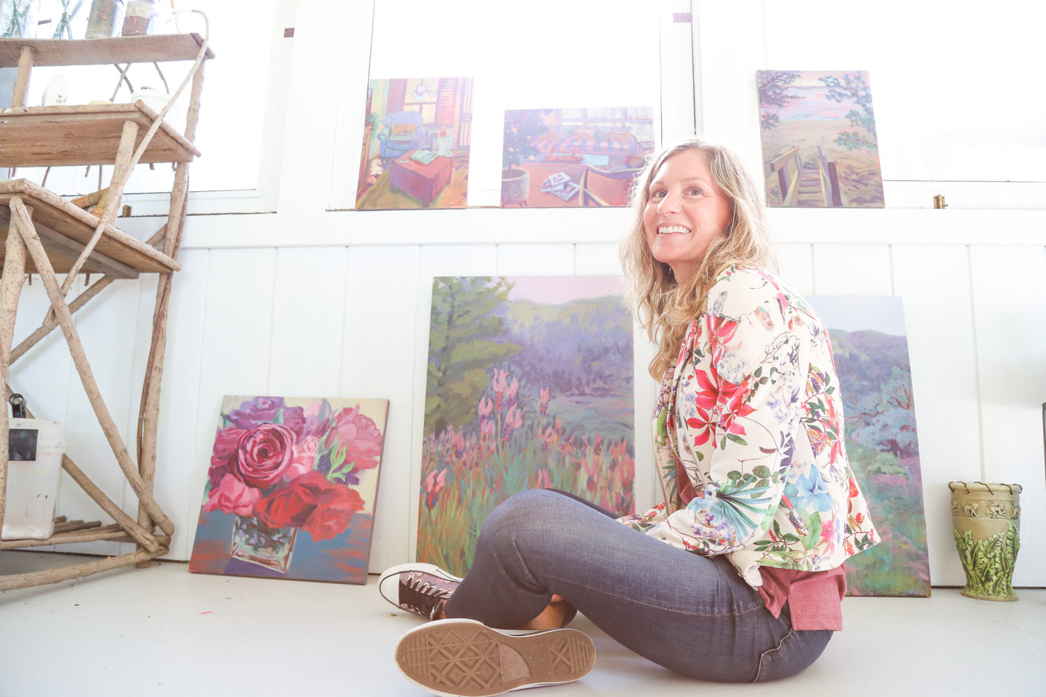 Andreoni mixes warm and cool values of red, blue and yellow to make custom colors, and brush thin layers of paint onto the canvas, adding lighter hues on top of darker ones which enriches the painting’s luminosity, and gives it a stronger sense of depth.