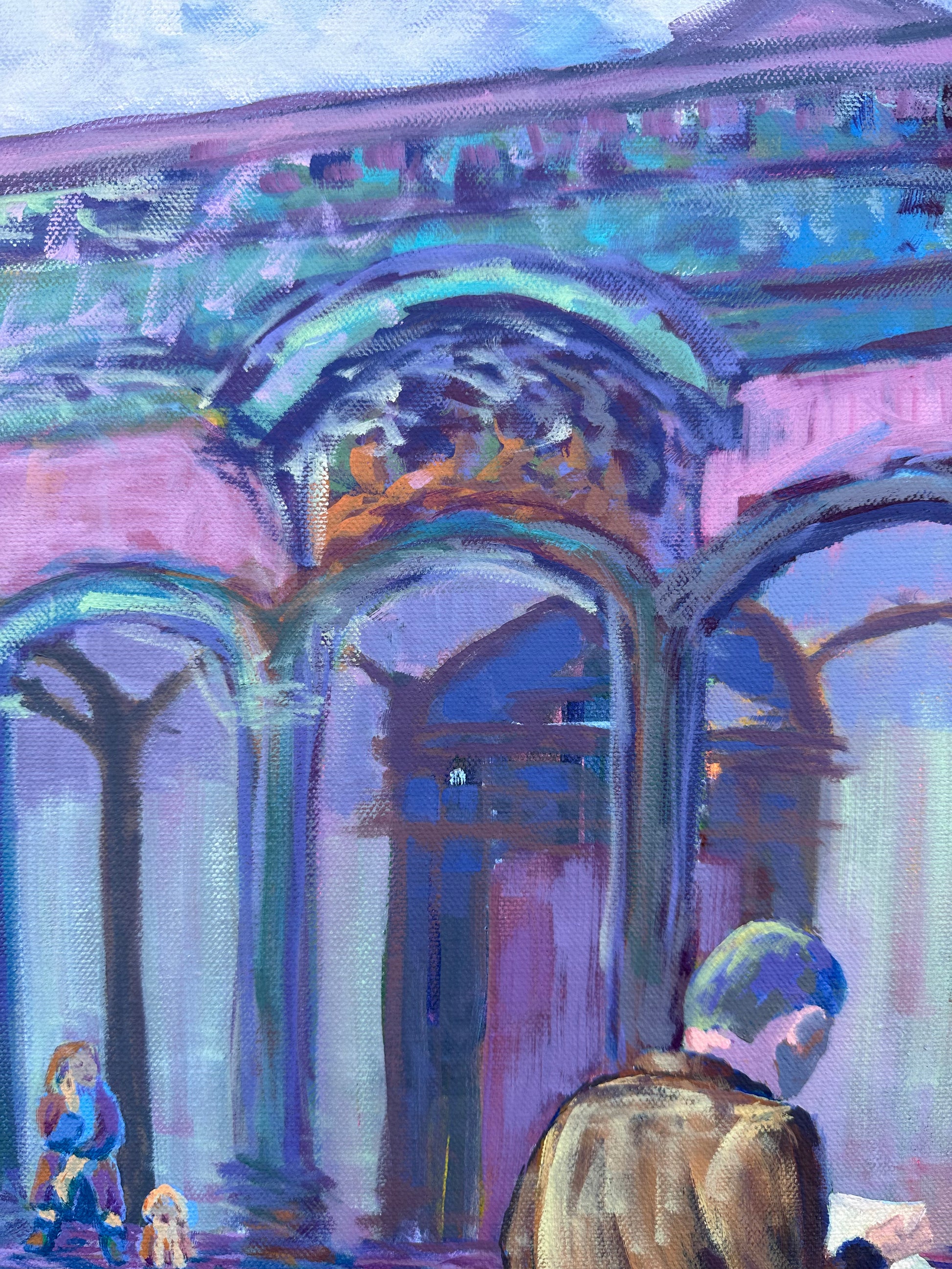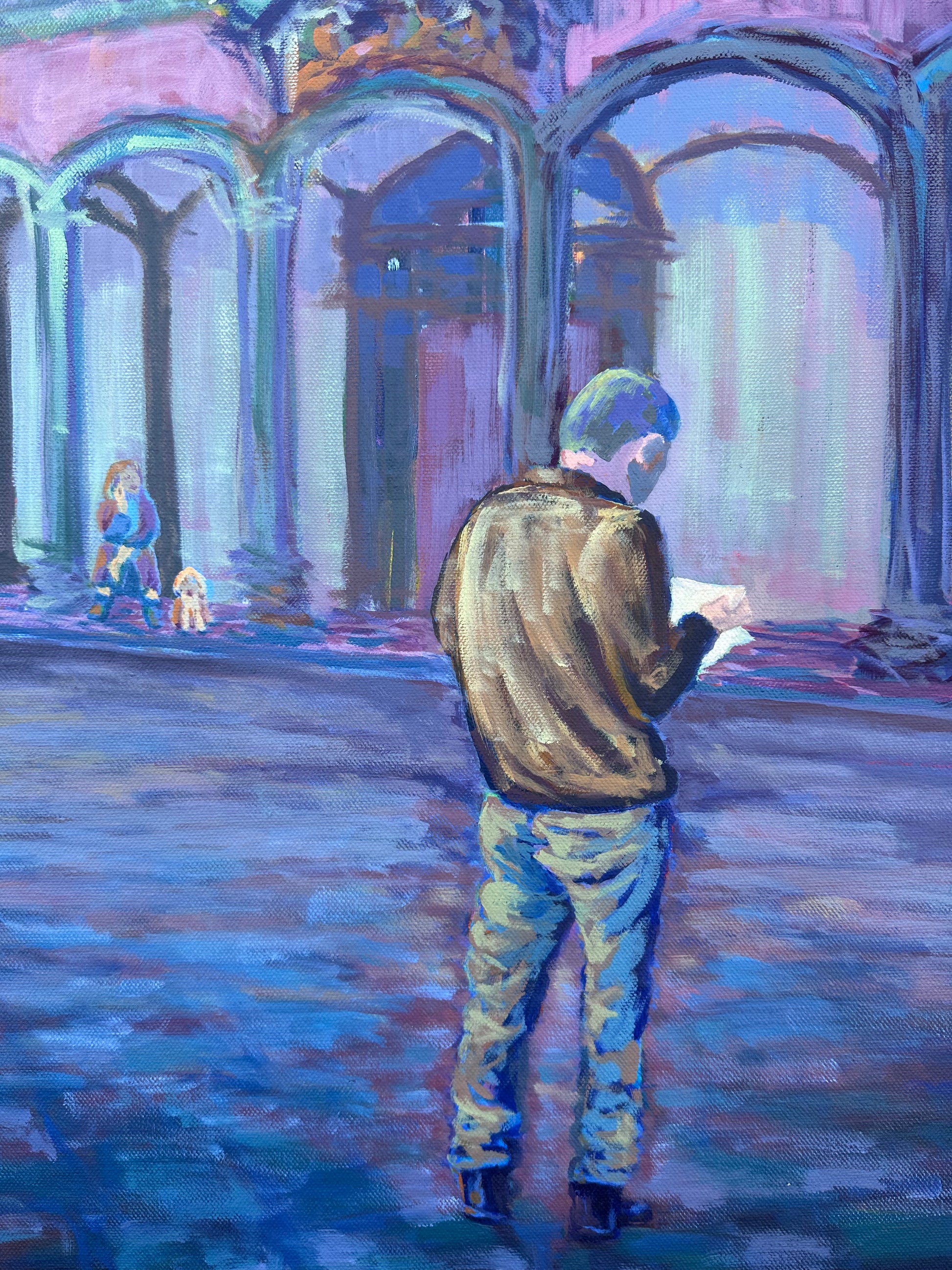 This painting is of me, my dog, Paulo, and my husband, Tino, on our honeymoon exploring the lovely city of Florence, Italy on a rainy day. This dreamy scene is based in reality, however some things I altered. I deleted all the people that were surrounding Tino and inserted myself and my dog sitting on the steps in the background. I think it made the painting more interesting and mysterious. What do you think?